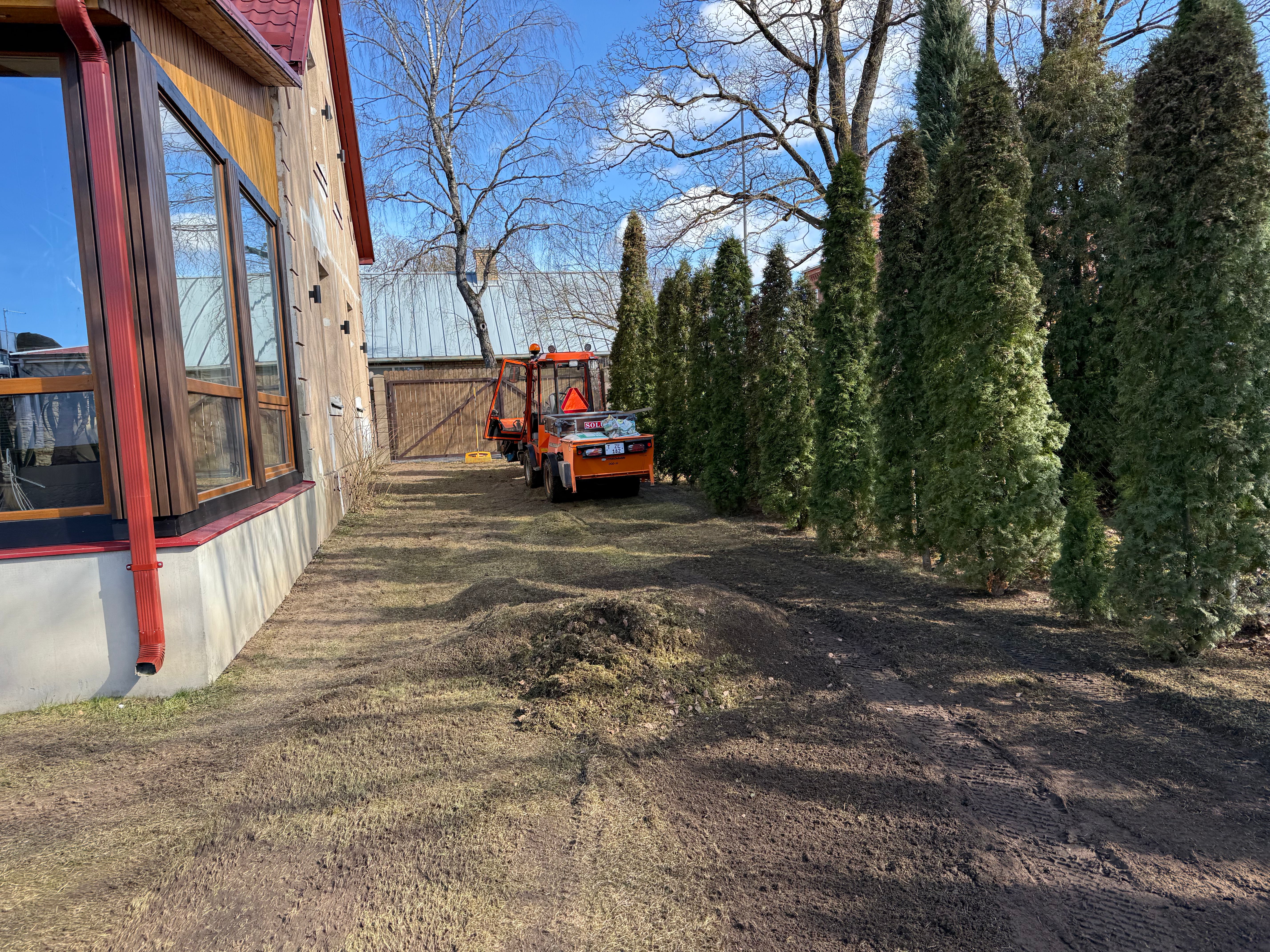 - Teritorijas labiekārtošanas darbus (ceļu izbūve, sētas uzstādīšana, zālāja atjaunošana, mīkstā seguma izveide, koku kniebšanas darbi ar kniebējgalvu)